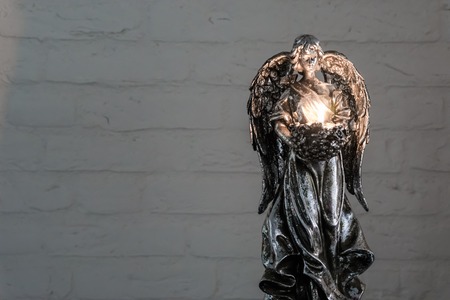A silver angel statue holding a burning tea light candle, Traditional christmas or spiritual background