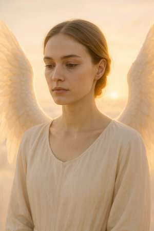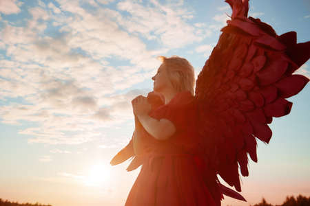 A woman is depicted as an angel with wings, standing in front of a large orange sun. Concept of peace and serenity, as the woman is at rest and the sun is setting in the background