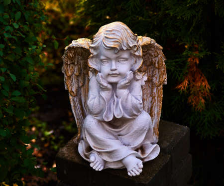 Statue of a peaceful angel child in the garden close-up. Stone cherub.