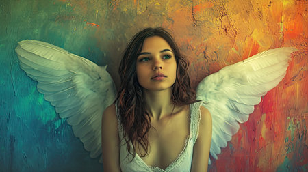 Beautiful young woman with angel wings on a colorful background, studio shot