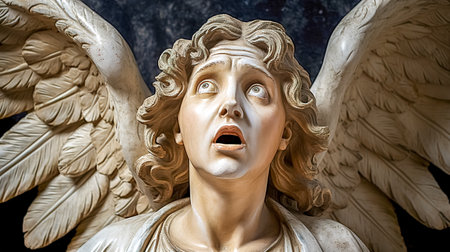 The image depicts an angelic figure with an astonished expression, eyes wide and mouth agape, with detailed feathery wings partially visible.