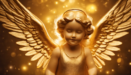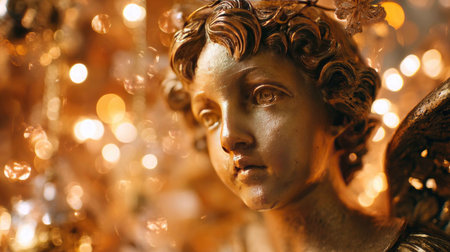 A close-up view of an angel statue featuring a golden finish, surrounded by soft, twinkling lights, evoking a serene and elegant atmosphere perfect for art and decor themes.