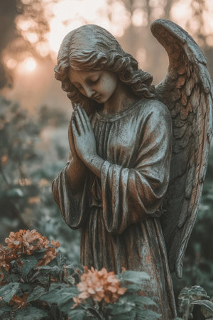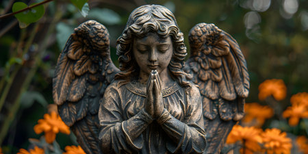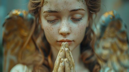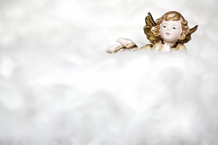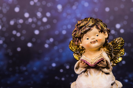 a small ceramic figure of a guardian angel clasping his hands in prayer. close-up, copyscape.