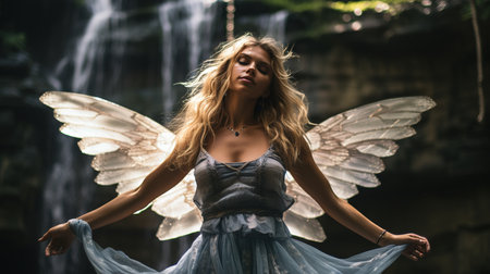 A young woman poses gracefully showcasing delicate angel wings and a soft fur coat embodying a serene and ethereal beauty.