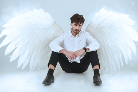 The male guardian angel looks with calm and hope in his eyes. Full-length studio portrait with white background.