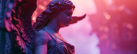 Holy angel with wings in Christian church. Ancient female sculpture. Retro neon effect