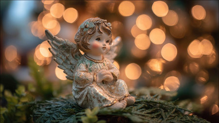 A beautifully detailed angel figurine sits atop a lush bed of greenery, illuminated by soft, glowing lights. This enchanting decor piece exudes warmth and tranquility, perfect for holiday celebrations.