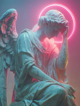 A stunning statue of an angel exuding emotion, illuminated by a neon halo, combining art and spirituality in a beautiful interplay of light and shadow.