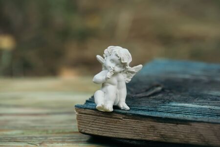 Beautiful cupid angel white porcelain figurine on wooden board on natural background
