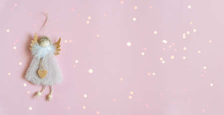 Figure of pink angel with dove in his hands on a branch of spruce, glass Christmas decoration, background with copy space
