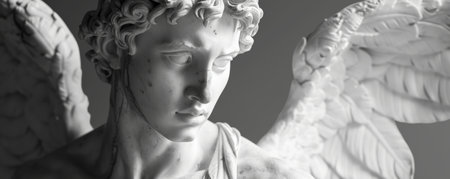 Monochrome sculpture of Eros, the Greek god, highlighting his youthful and playful expression.