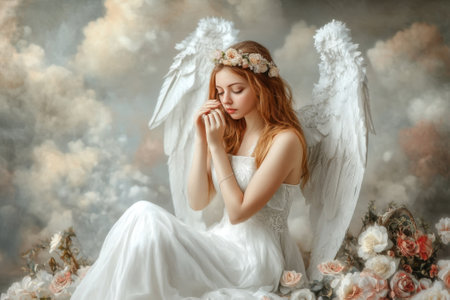 A young woman with angel wings sits gracefully amidst a garden of soft flowers, lost in contemplation.