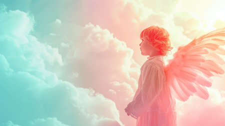 Valentine banner. Kid angel in angelic wings with prayer hands. Cupid boy. Valentines day gift card