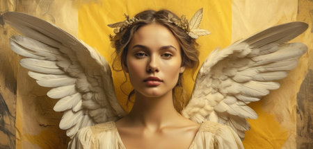 Portrait of a beautiful young woman with white wings on a yellow background