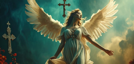 Angel girl with white wings and a cross on the sky background.