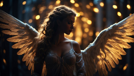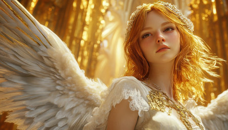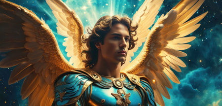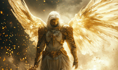A powerful angelic figure clad in ornate armor stands confidently with large golden wings extended. Glimmers of light surround this divine being in a dramatic atmosphere.