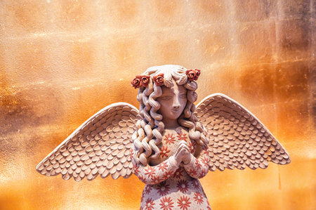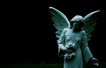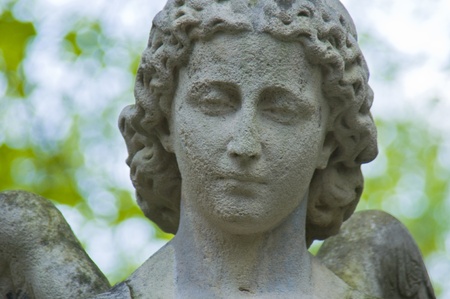 Angel statue in a cemetery, closeup of a religious symbol.
