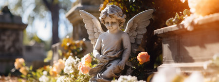Stone angel with flowers in a cemetery