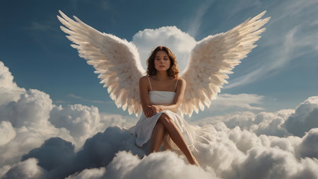 A beautiful white female angel sits with wings on a cloud in heaven