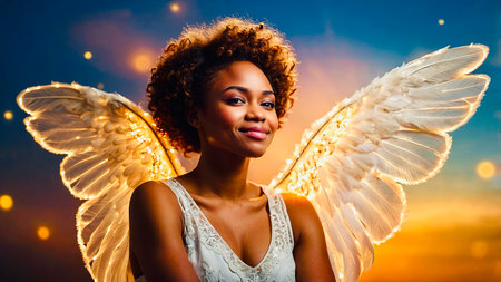 Elegant African American Woman With Angel Wings Against a Colorful Sunset Background.