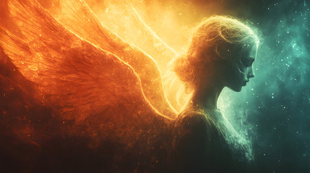 Angel woman with wings and fire background, 3d render illustration.