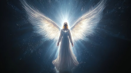 Beautiful angel with glowing white wings holy light white dress ethereal celestial serene fantasy spiritual mystical