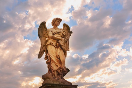 Marble statue of Angel with the Whips at sunset, one of the ten angels on Saint Angel Bridge, symbols of Christs Passion, Rome, Italy