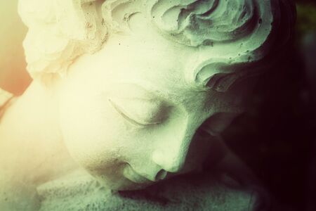 Statue of a peaceful angel child in the garden close-up. Stone cherub.