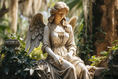 Serene angel statues guard historical monuments in peaceful cemetery landscapes