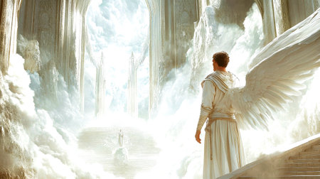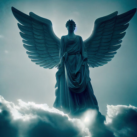 Majestic angel with large white wings standing against a sky background, a conceptual spiritual image