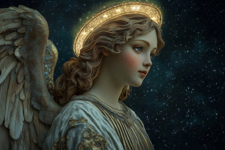 Christmas angel with a glowing halo, starry sky. illustration. By generative Ai