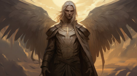 angel with wings in the night sky, sun shining, ravencore style, genre painting, 2d game art, masculine, dark beige and gold, bold character designs, captivating gaze. ai generated