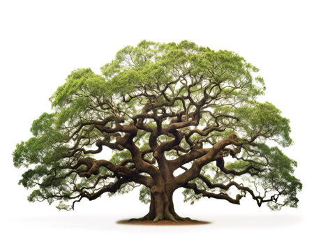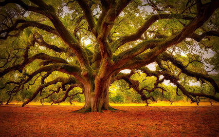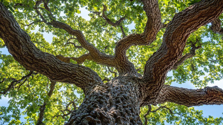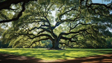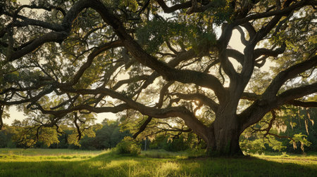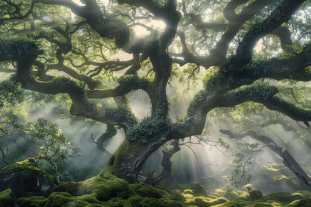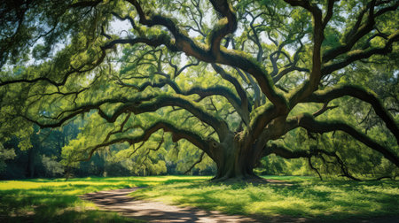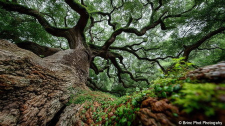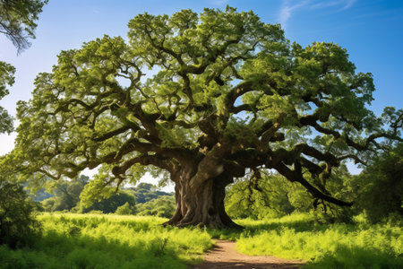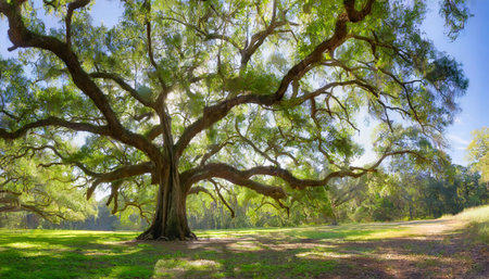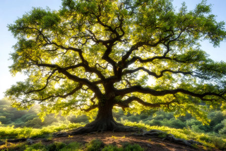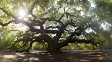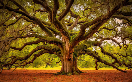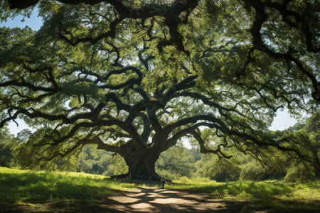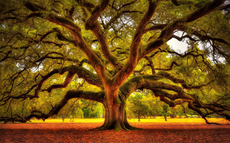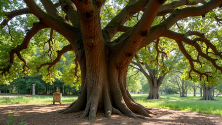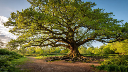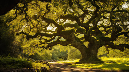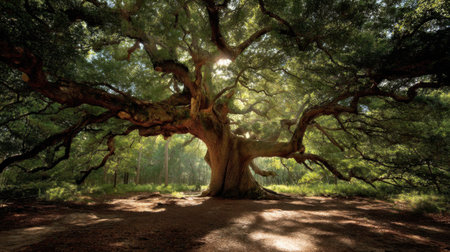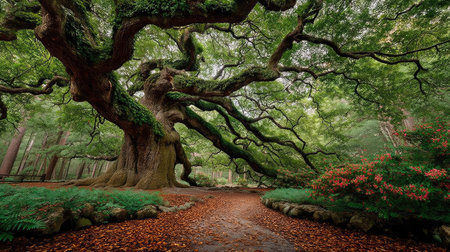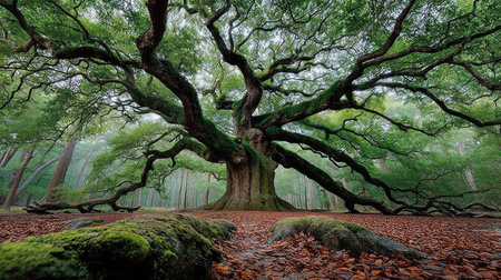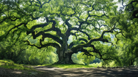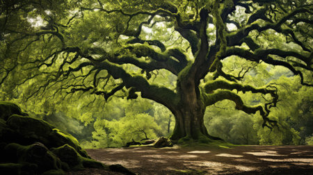 A stunning display of an ancient tree with expansive branches and vibrant green leaves. The serene atmosphere captures the essence of nature's beauty and tranquility.