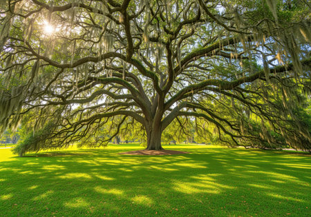 Majestic ancient live oak tree featuring massive, sprawling branches draped with spanish moss, casting long shadows across a perfectly manicured, sunlit green lawn.