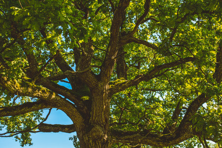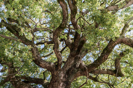 The trunk and branches of an old oak tree viewed from below. Crown of an old oak. Very old oak against the sky in the summer. Green leaves in the garden, park, rest area