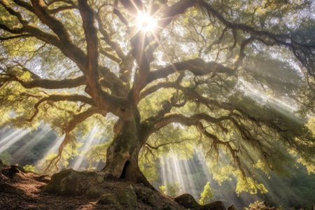 Majestic Ancient Tree Illuminated by Sunbeams Through Forest Canopy in Dreamy Landscape AI Generative