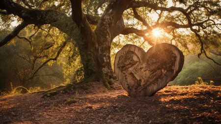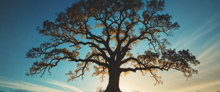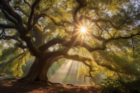 AI Generated. Majestic Tree Silhouette with Sunlight Filtering Through Branches