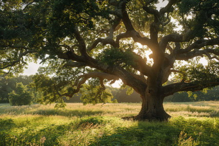 Sunlight illuminates the branches and leaves of a majestic oak tree standing in a field at sunrise