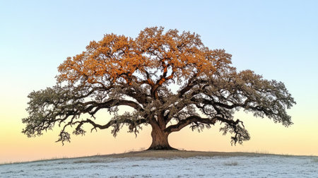 This stunning image showcases a majestic oak tree with golden leaves against a winter sky at sunrise. The serene landscape captures the beauty of nature's cycle.