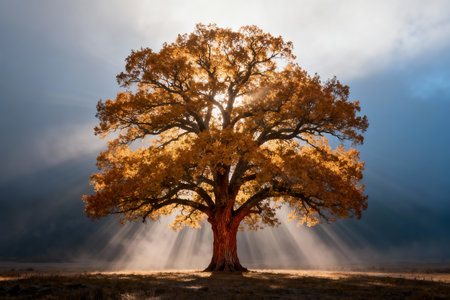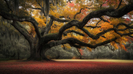 This stunning image captures a majestic tree in autumn, showcasing vibrant leaves and sprawling branches. A tranquil scene perfect for nature lovers.