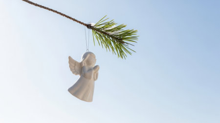 christmas angel hanging on a branch of a pine tree in the blue sky