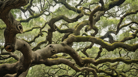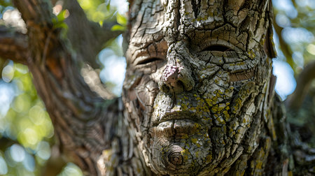 Intricate bark patterns seamlessly blend with the face of a majestic oak tree with sunlight dappling through the lush green canopy creating a captivating and conceptual natural scene