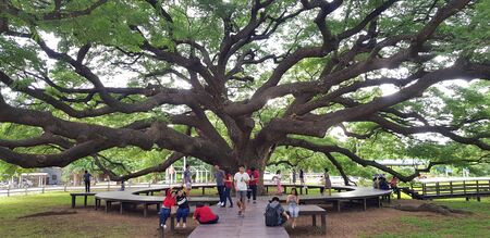 Kanchanaburi, Thailand- July 22, 2019: Many tourism or People travel to visit and seeing Giant Monkey Pod tree at Kanchanaburi, Thailand. Landmark for travel in Asia.Old big tree and Beauty of Nature
