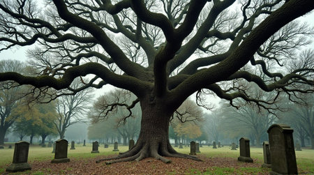 Ancient oak tree stands sentinel in a misty graveyard, its bare branches reaching skyward above the weathered tombstones.