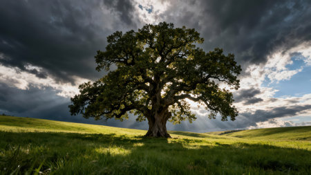 Solitary grand oak tree illuminated from behind by brilliant crepuscular rays breaking through heavily shadowed cumulonimbus clouds above a lush emerald green sloping pasture.