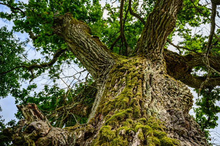 Oak view from bottom to top. A mighty old tree with moss on the bark and green leaves.