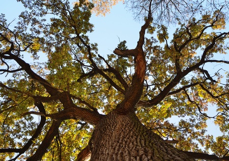 Massive stem of venerable oak is photographed from below against yellow sunlit foliage and the blue sky.