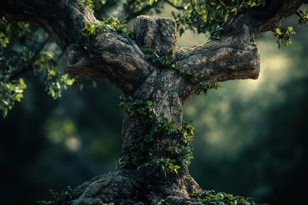 A tree with a cross on it is growing in a forest. The tree is surrounded by green ivy and has a lot of leaves. The image has a peaceful and serene mood, as the tree seems to be growing naturally