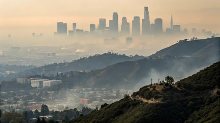 los angeles skyline and suburbs wrapped in smoke from woosle fires in 2018