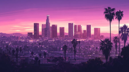 A metropolitan skyline, numerous neon lights, dramatic lighting, vivid hues of purple and pink, and out-of-focus palm plants can be seen in the foreground. AI generator